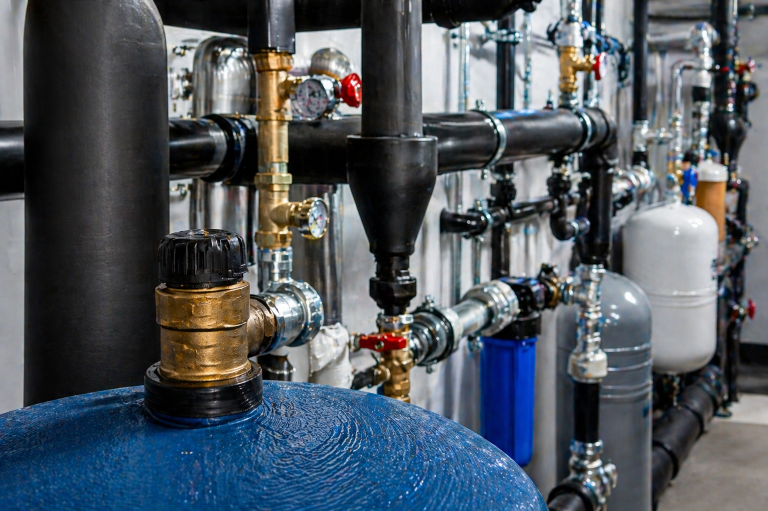 Filtri, addolcitori, sistemi di affinamento, resine, contenitori di reagenti, materiali filtranti.